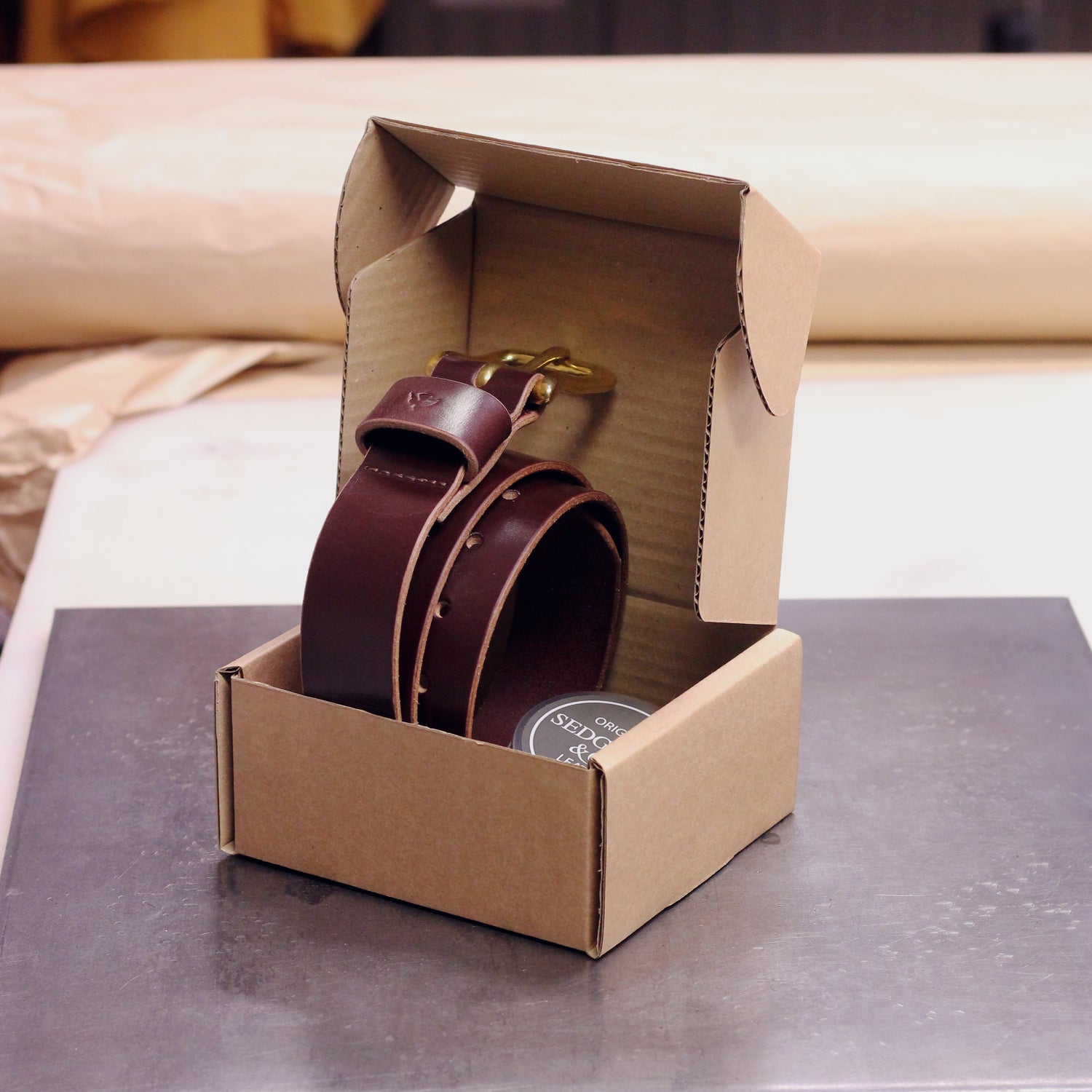 Cut from J. & E. Sedgwick bridle leather, it’s finished with hand-bevelled and burnished edges, a sturdy keeper stamped with my trademark logo. Seven holes spaced an inch apart for reliable adjustment.